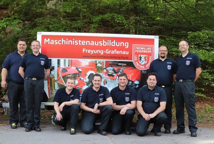 Ein Teil der Maschinistenausbilder mit neuem Anhänger für das Ausbildungsmaterial.